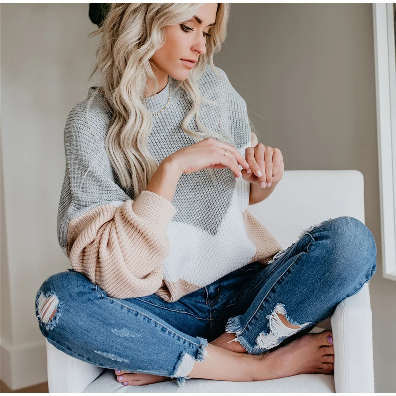 ORIGINAL NewAsia Winter Sweater Women 2019 Fashion Long Lantern Sleeve Contrast Color Striped Knitwear Casua